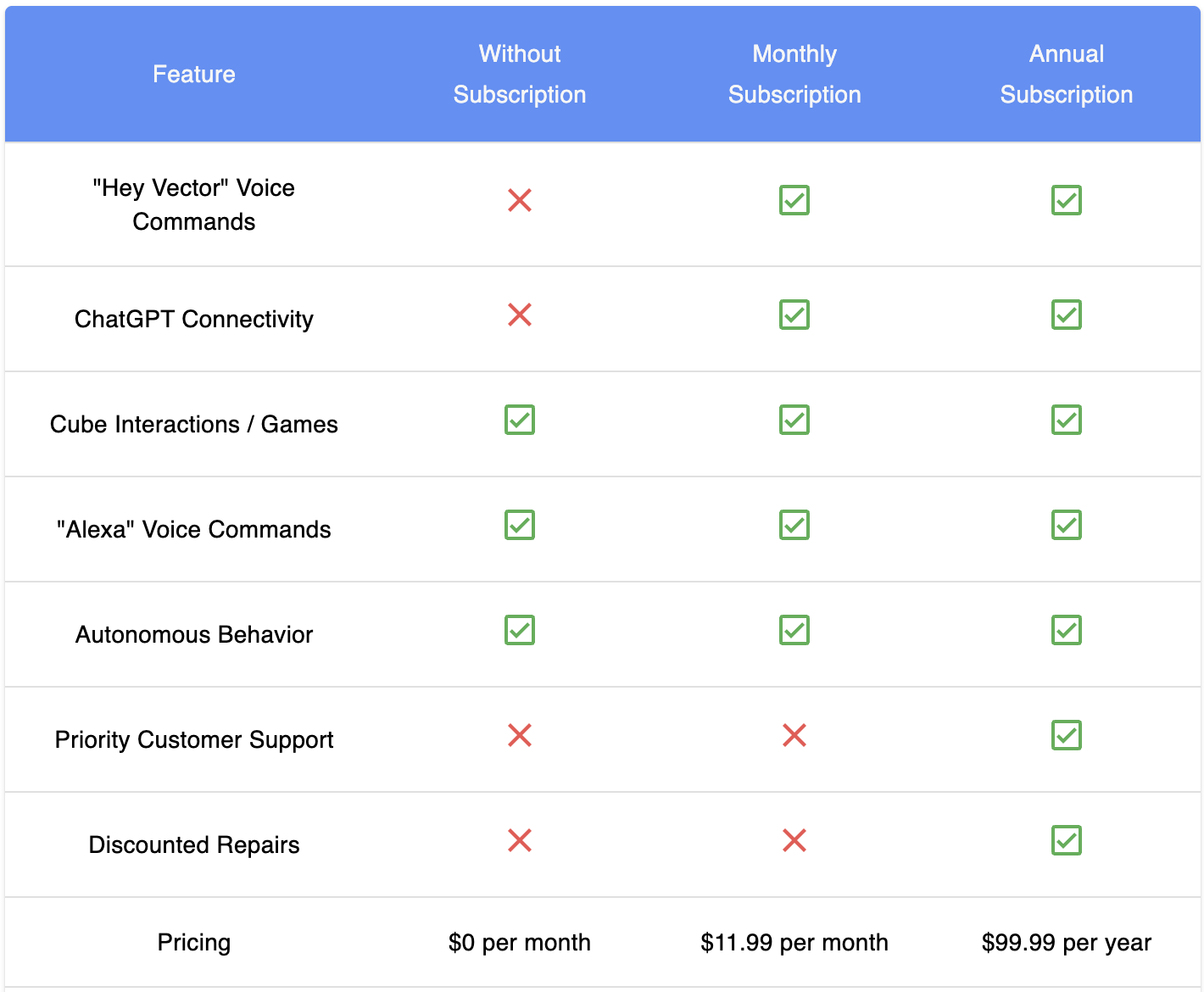 There are many benefits to subscription or membership with Digital Dream Labs for your Vector. These include voice command access as well as new features, such as animations, expressions, games, and more! The chart below outlines the benefits you receive with your Membership.